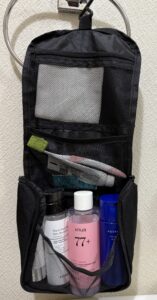 ホテルの洗面所やタオルハンガーにそのまま吊るして使えるため、狭い洗面台でも占領せず、中身を一覧できるため出し入れがとてもしやすいです。